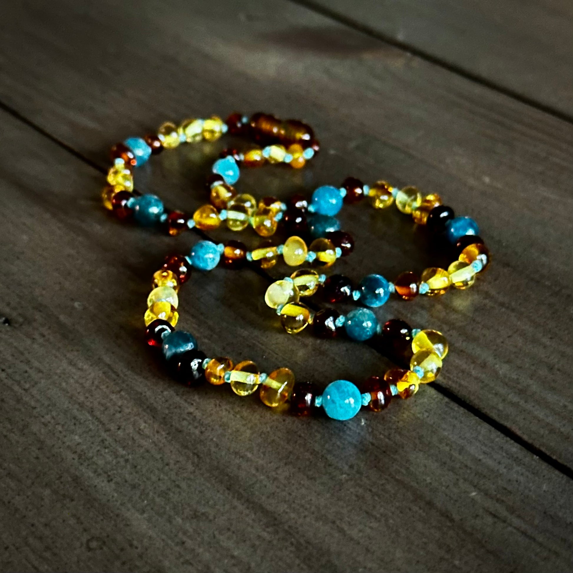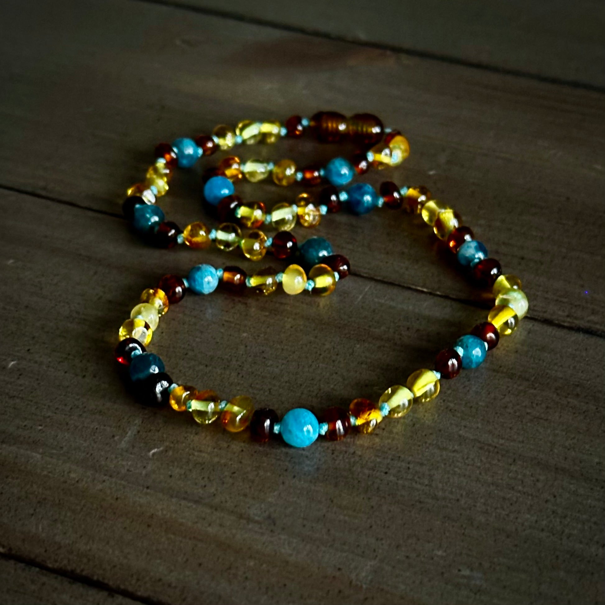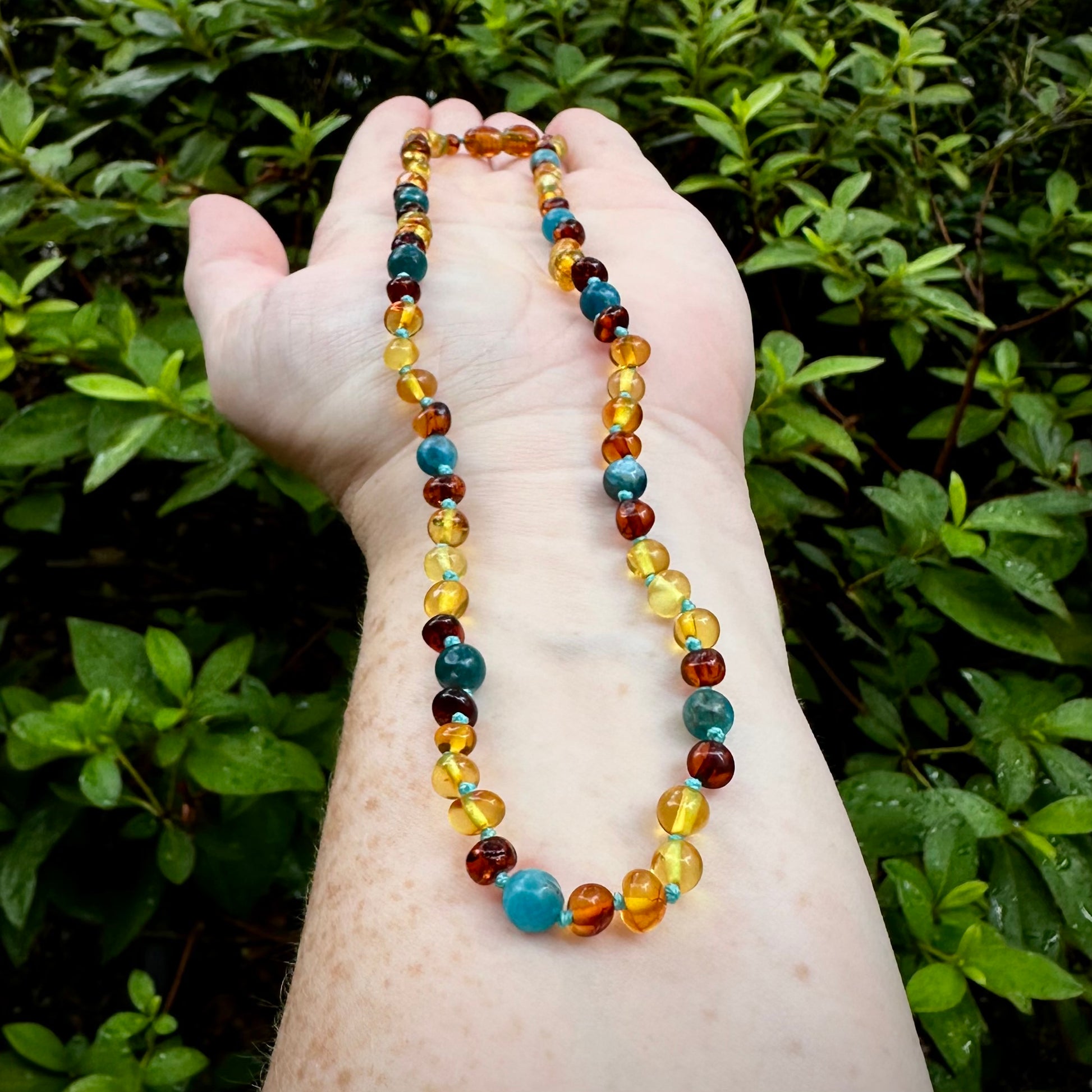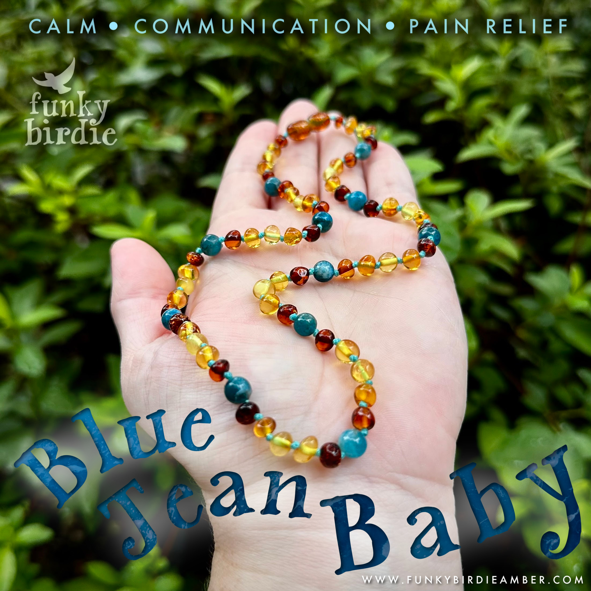 Blue Jean Baby Necklace is strung on mint-toned nylon cord & finished with a coordinating plastic screw clasp. Due to the natural materials used, your piece will differ slightly than what is pictured. Photos have been enlarged to show detail. Beads measure approx. crystals 6mm, amber measures 4-6mm. Colors shown may vary due to your monitor settings. This listing is for one necklace, other items shown are other pieces in this line & photo props.Â