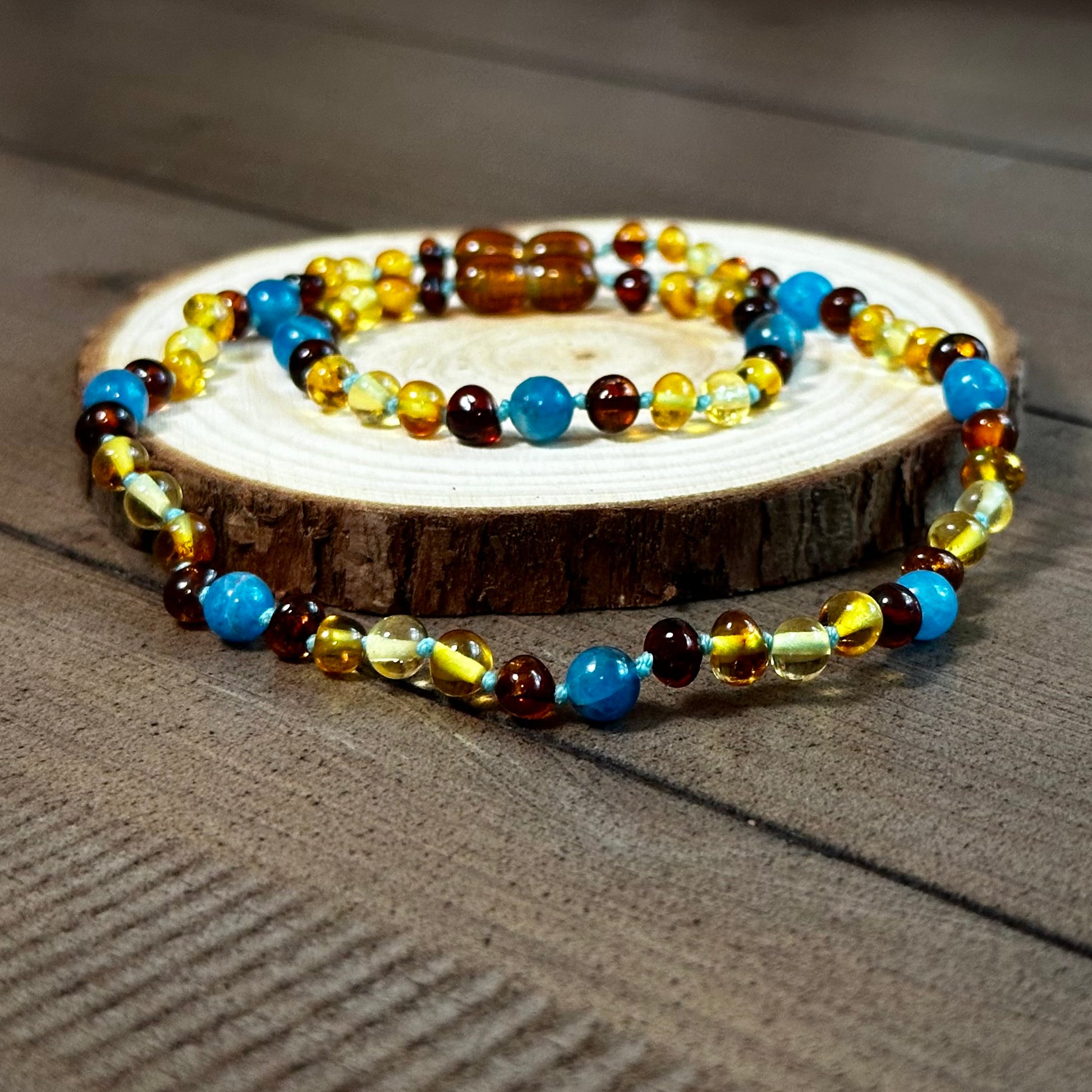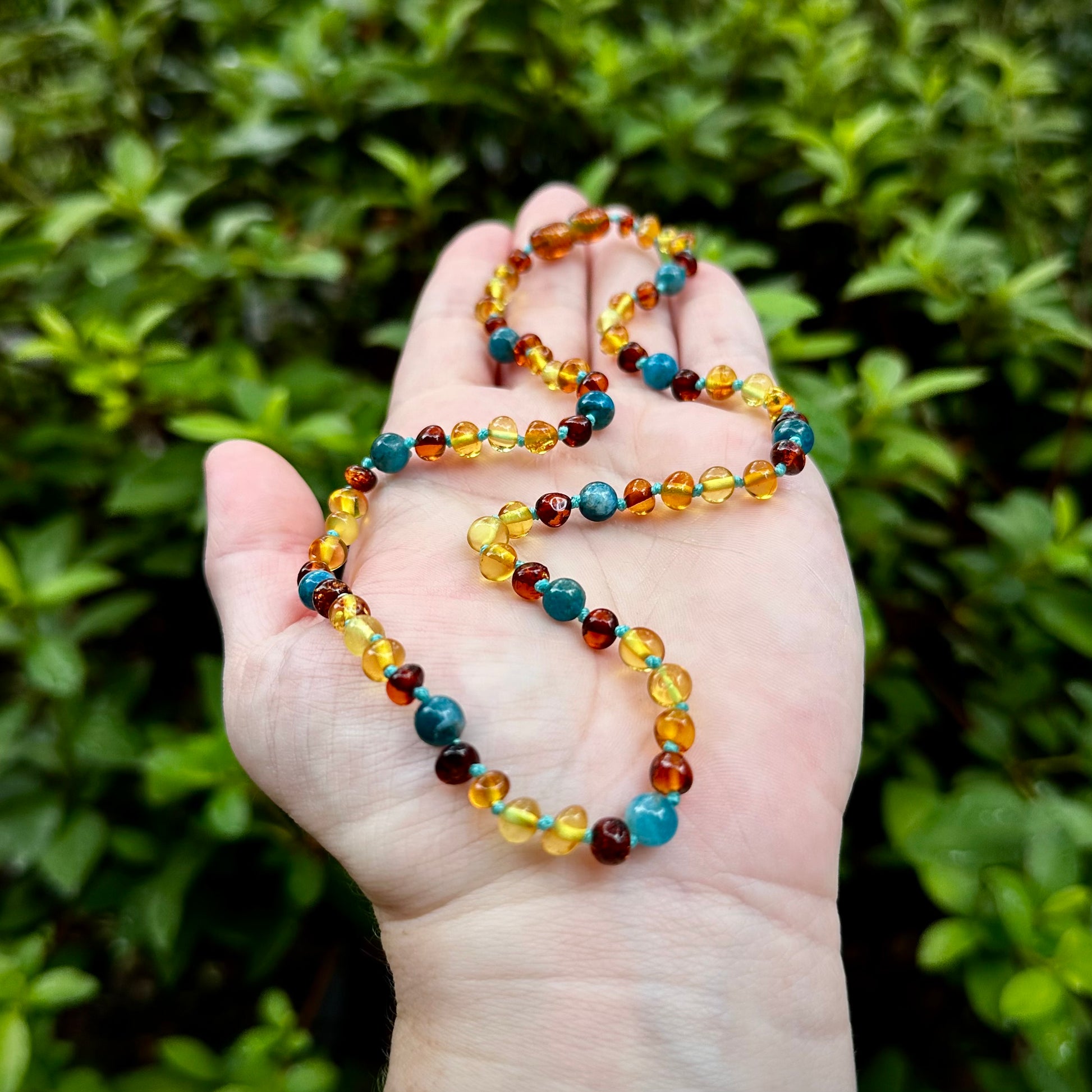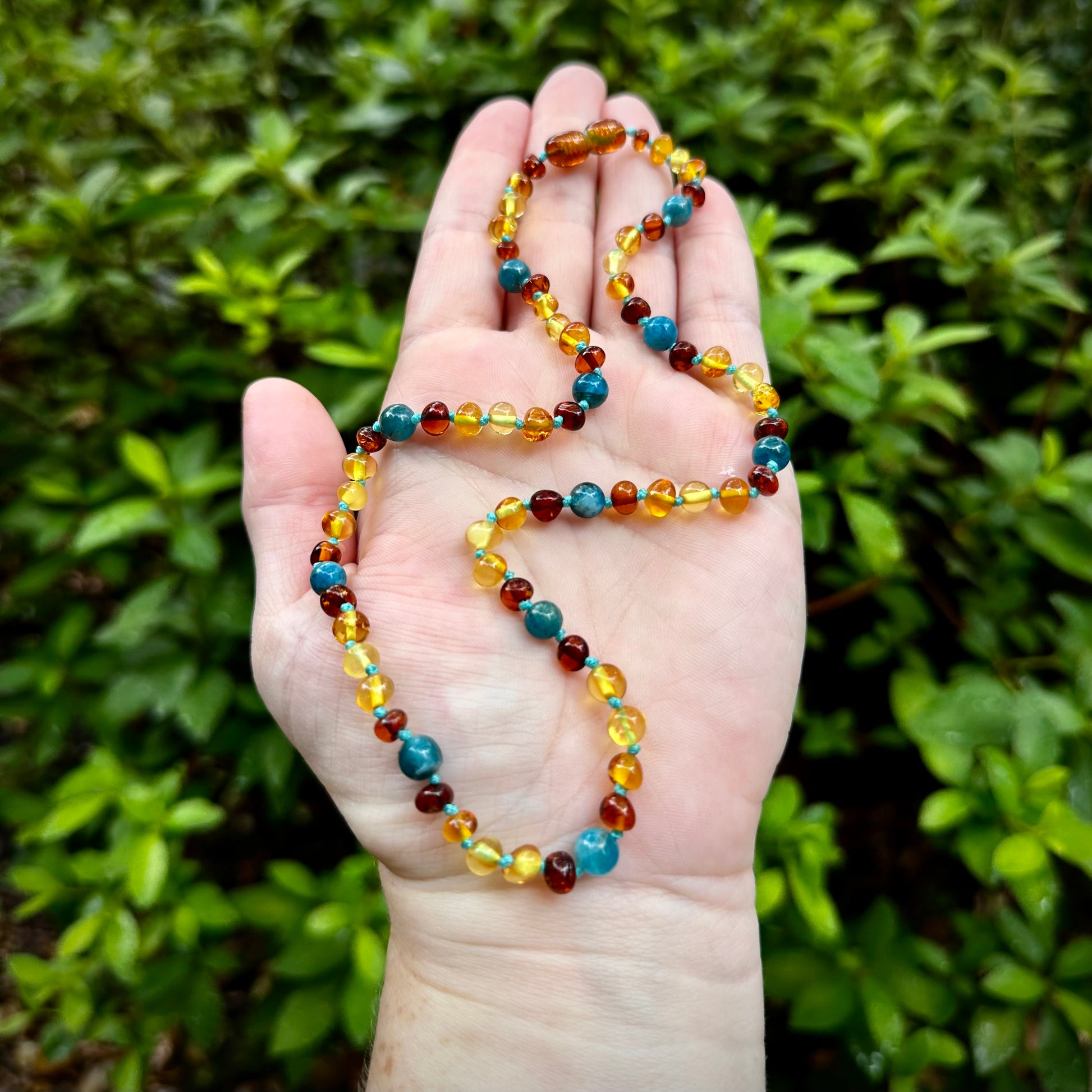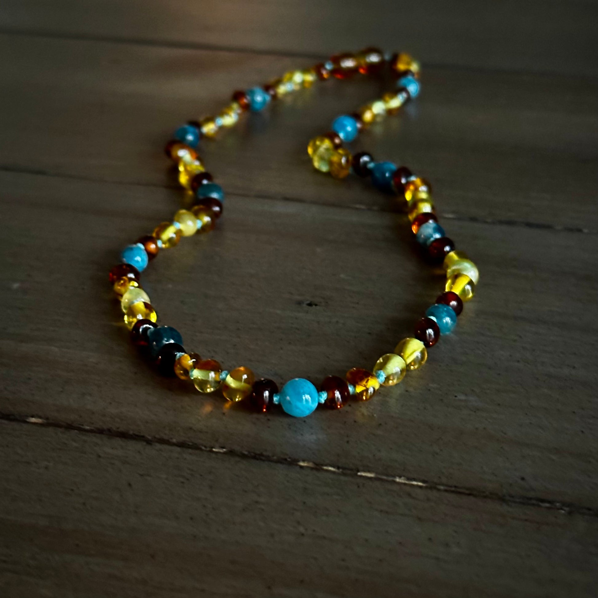 Blue Jean Baby Necklace is strung on mint-toned nylon cord & finished with a coordinating plastic screw clasp. Due to the natural materials used, your piece will differ slightly than what is pictured. Photos have been enlarged to show detail. Beads measure approx. crystals 6mm, amber measures 4-6mm. Colors shown may vary due to your monitor settings. This listing is for one necklace, other items shown are other pieces in this line & photo props.Â