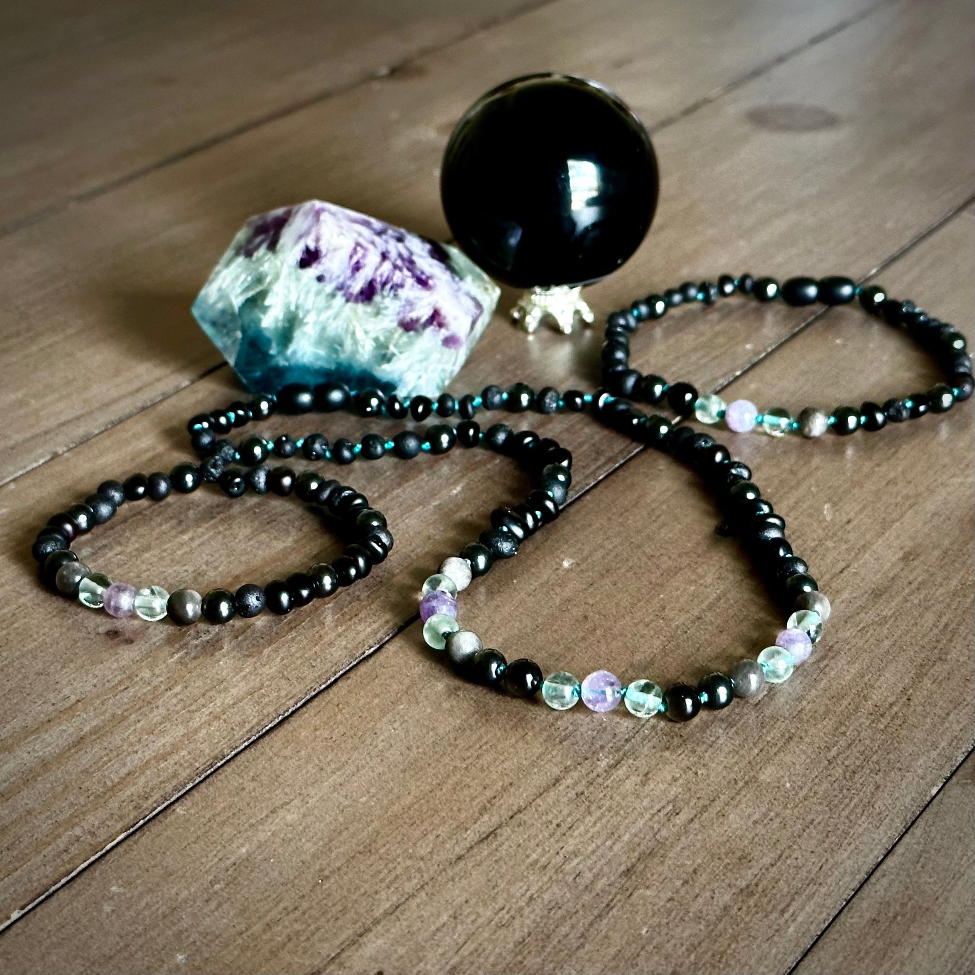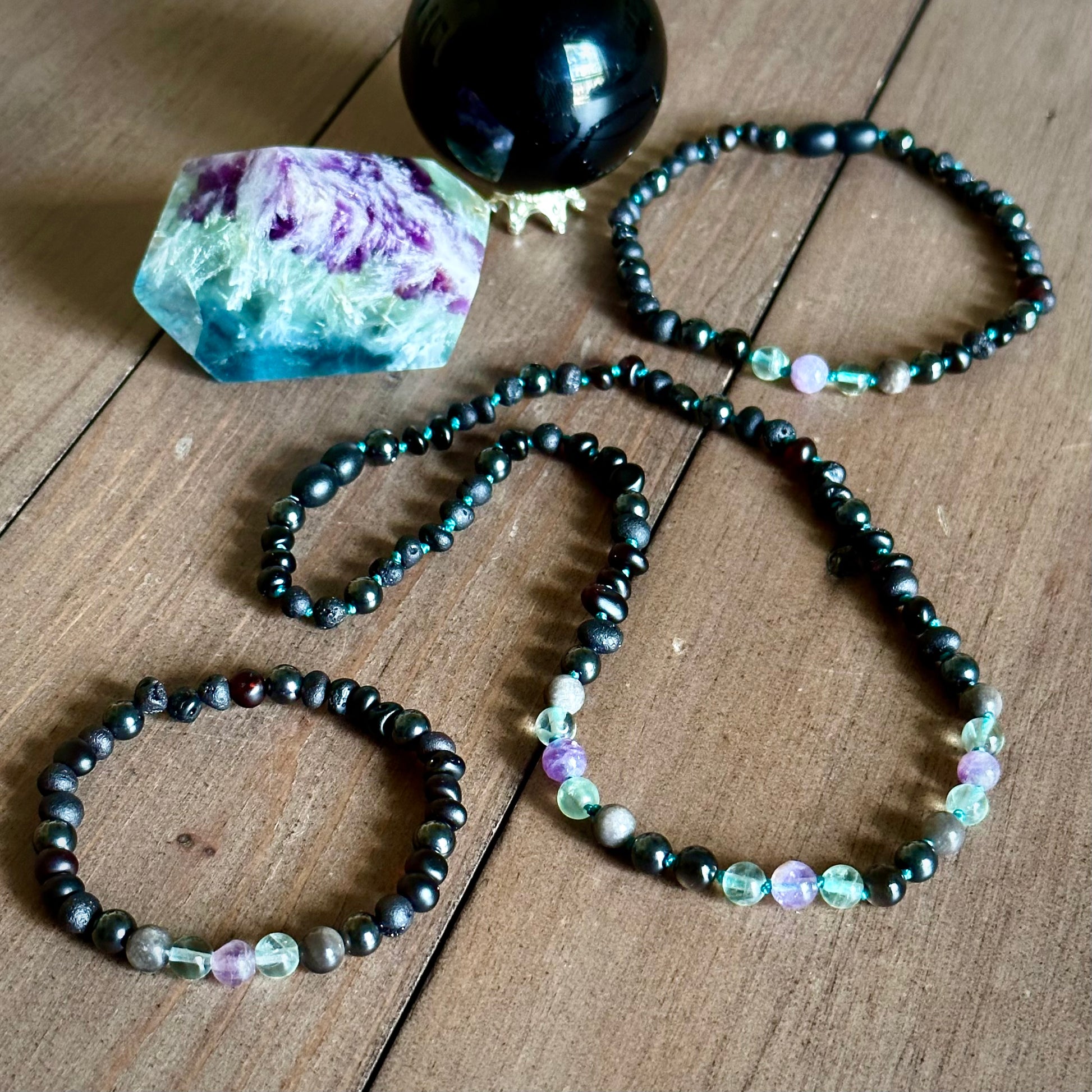 This design starts with my go-to duo for pain & swelling relief -- amber + magnetic hematite, stacked with crystals for even more healing & relief from chronic pain...