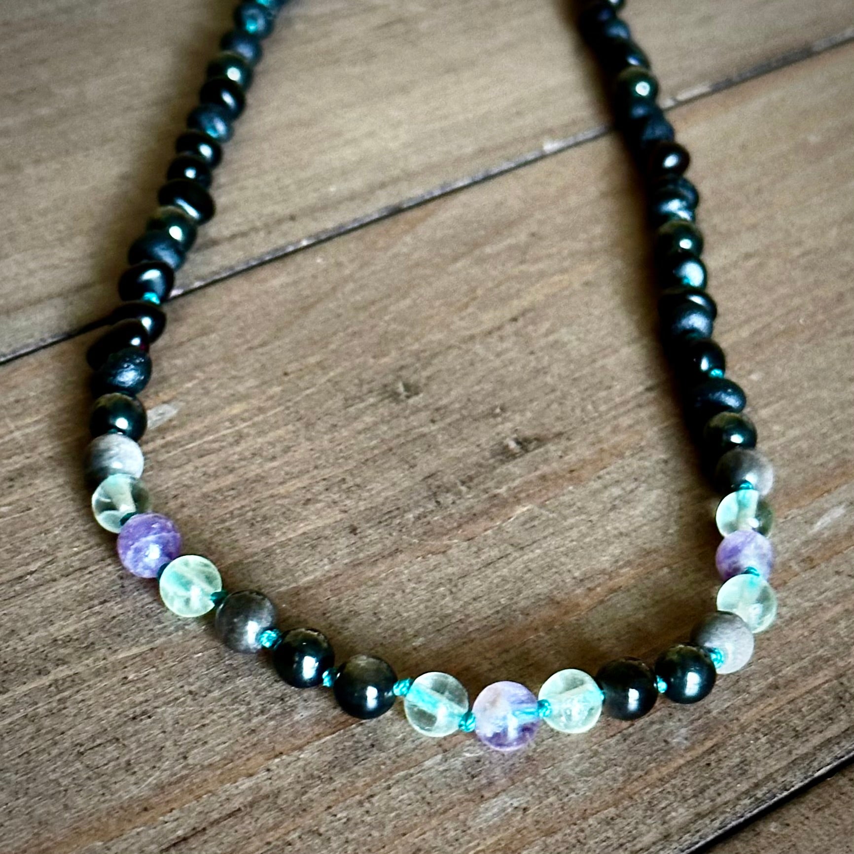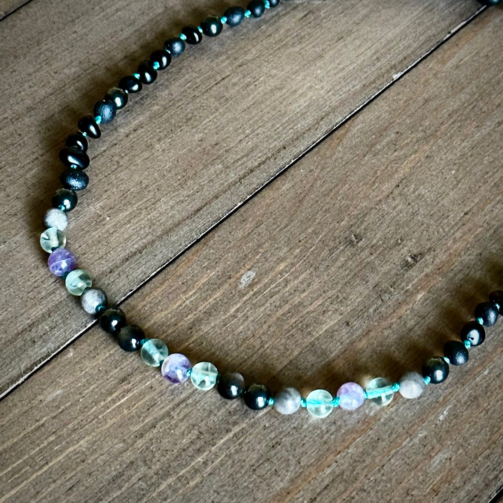 Bulletproof Necklace is hand-knotted between each bead & strung on peacock-toned nylon cord, finished with a black plastic screw clasp for durability. Beads measure approx. crystals 6mm, amber 4-6mm. Due to the natural materials used, your piece will differ slightly than what is pictured. Photos have been enlarged to show detail. Colors shown may vary due to your monitor settings. This listing is for a one necklace, other pieces shown here represent the other pieces in this design & photo props.