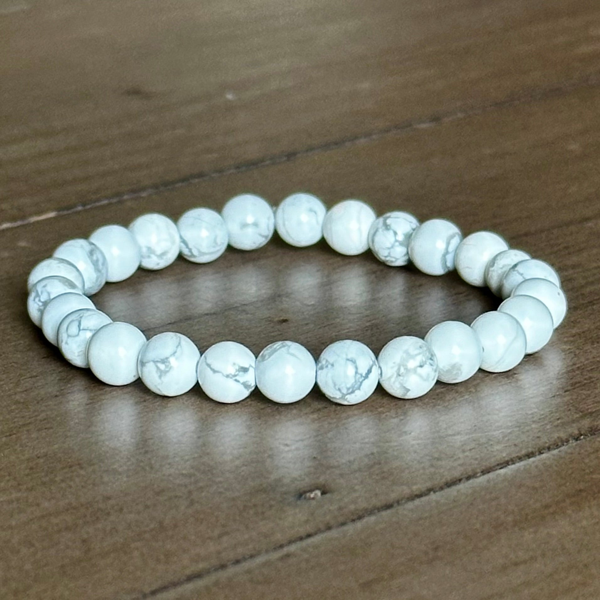 Howlite Single Stone Stretchy Stacker bracelet is strung on stretch cord & does not require a clasp. Beads measure approx. 6mm. Due to the natural materials used, your piece will differ slightly than what is pictured. Photos have been enlarged to show detail. Colors shown may vary due to your monitor settings. This listing is for a one bracelet, other items shown are photo props.