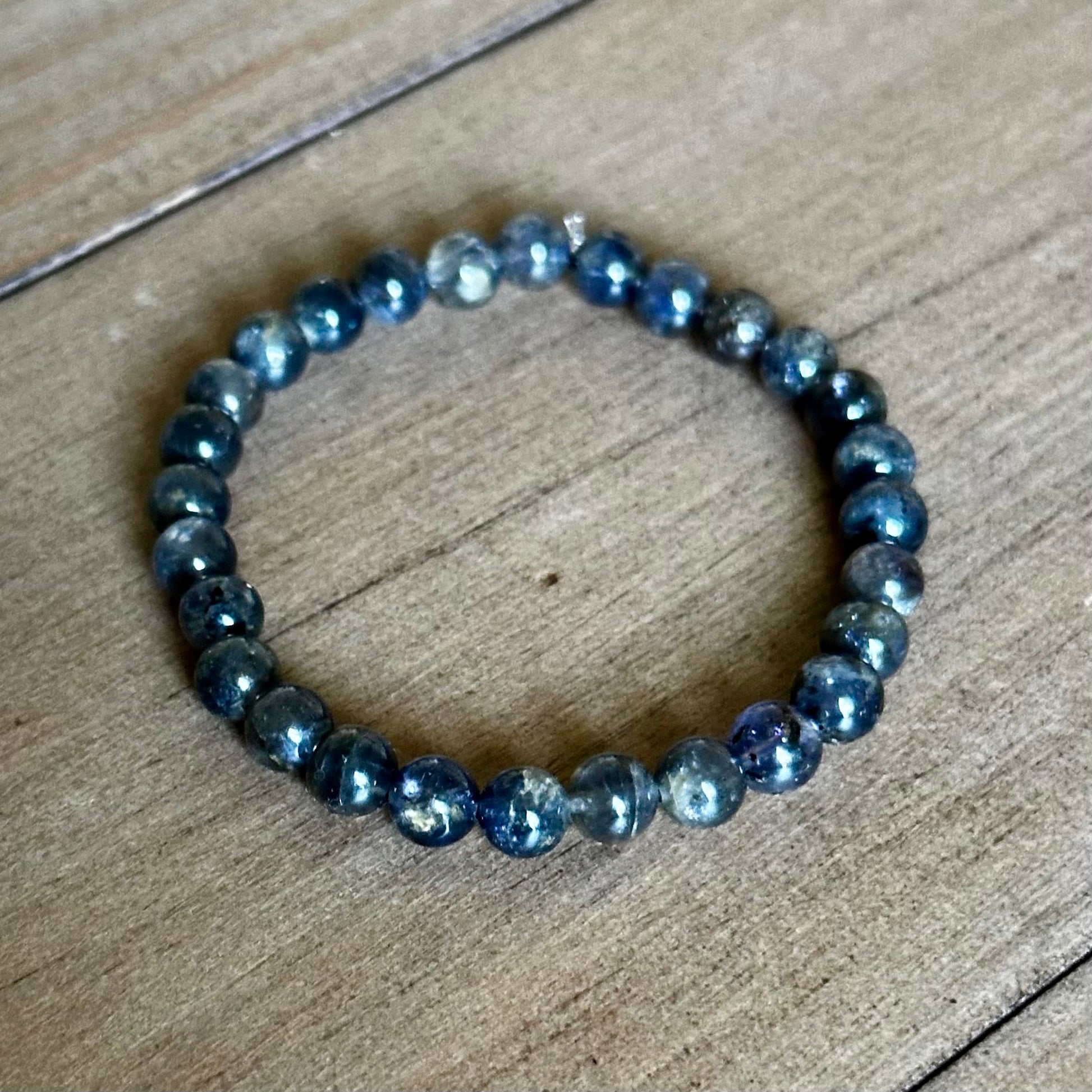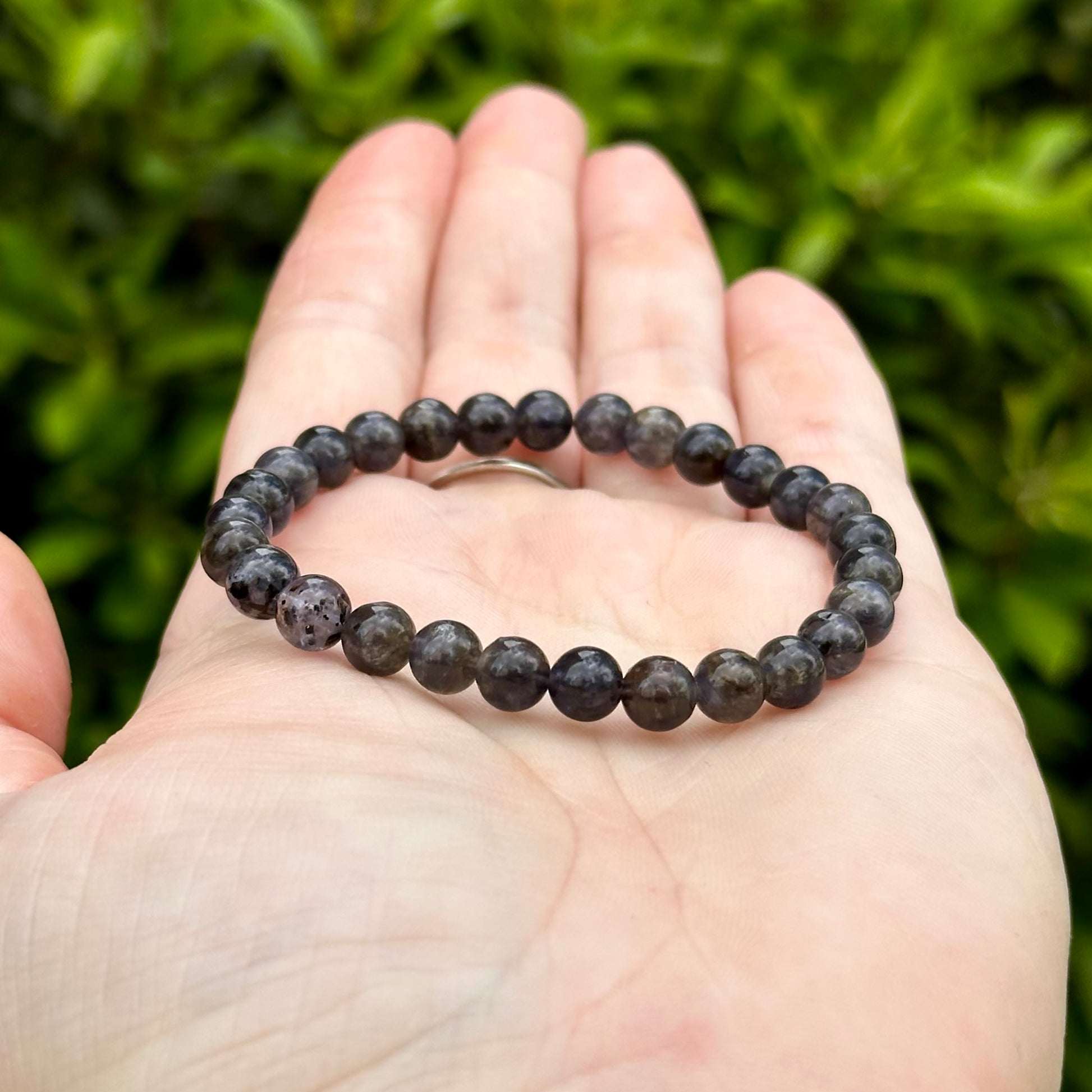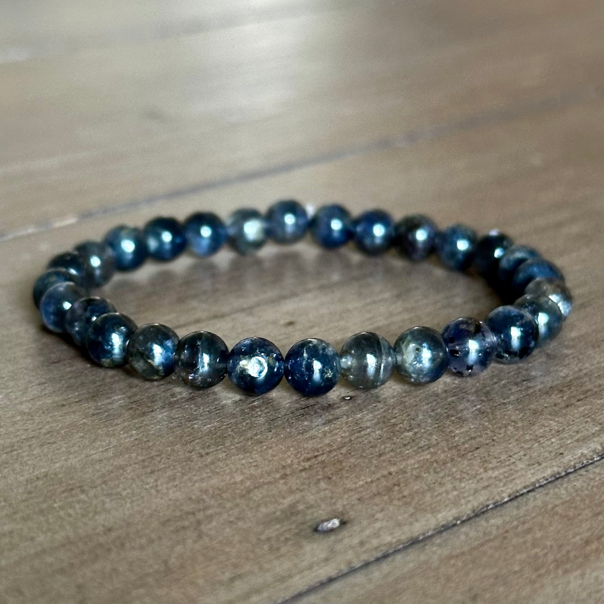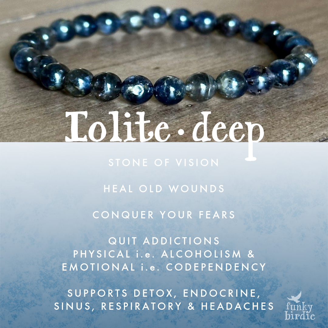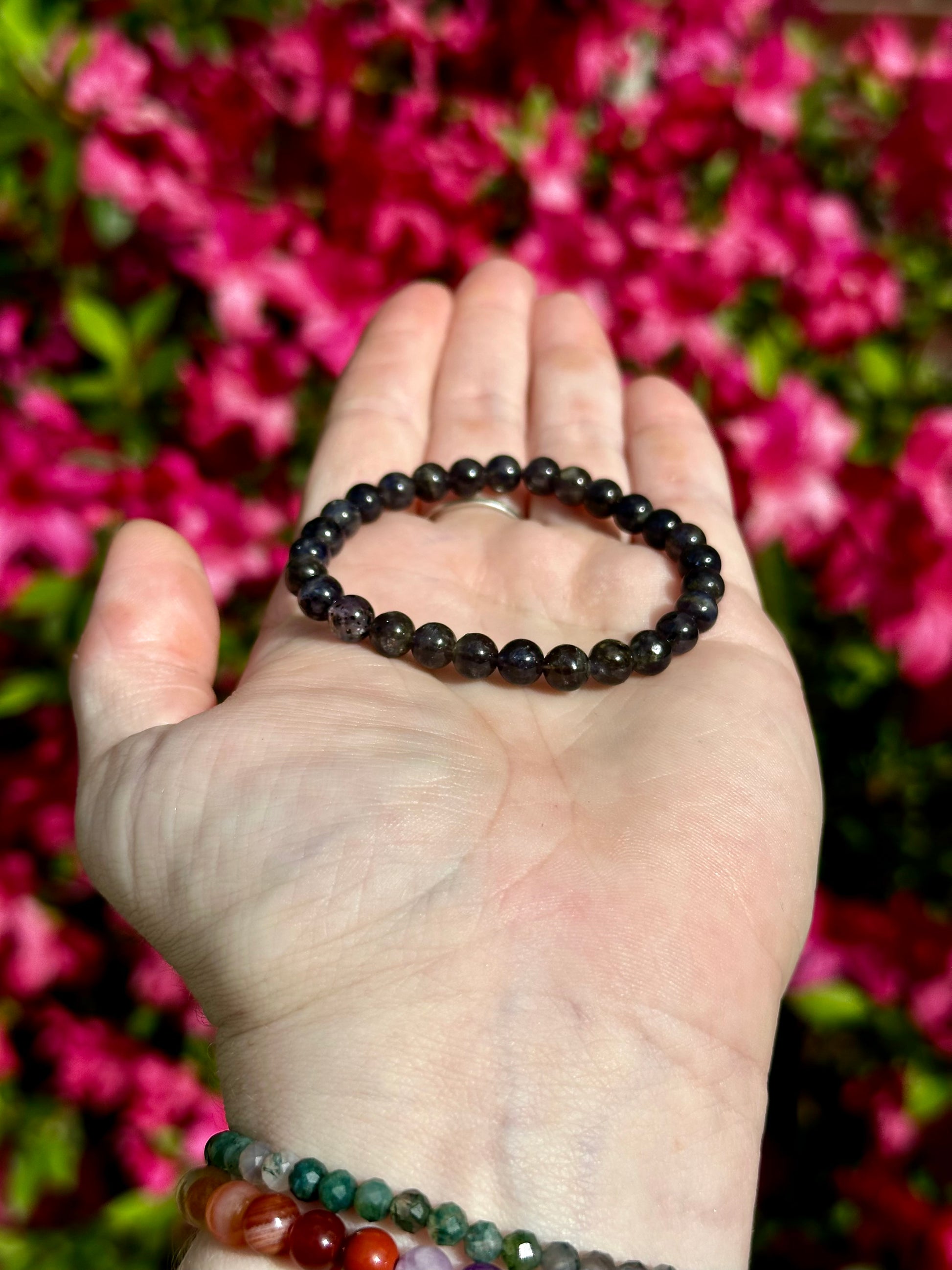 Iolite Deep Single Stone Stretchy Stacker bracelet is strung on stretch cord & does not require a clasp. Beads measure approx. 6mm. Due to the natural materials used, your piece will differ slightly than what is pictured. Photos have been enlarged to show detail. Colors shown may vary due to your monitor settings. This listing is for a one bracelet, other items shown are photo props.Â