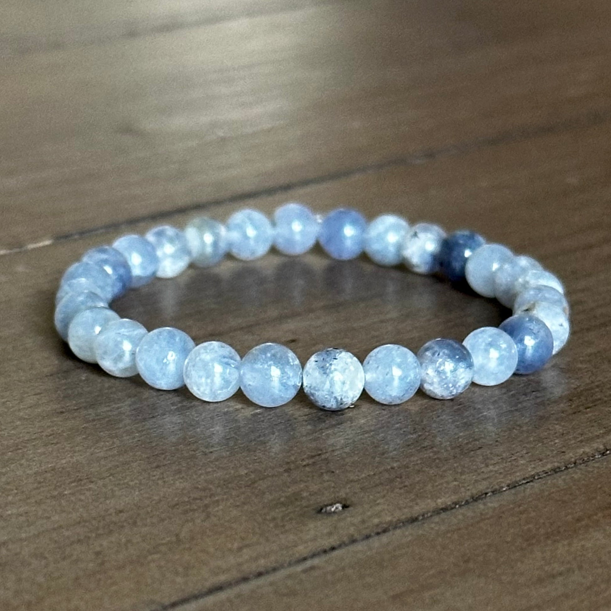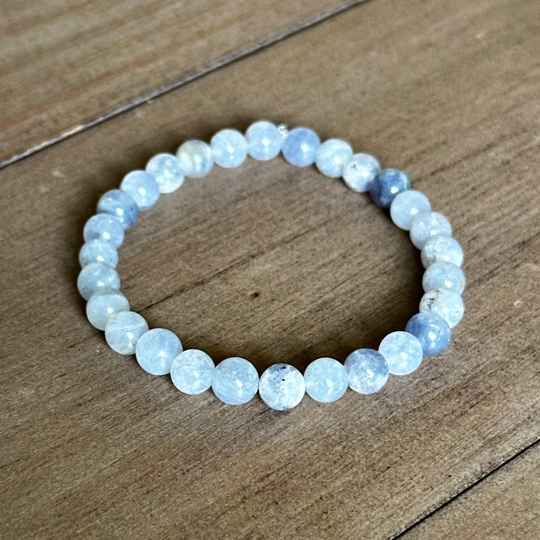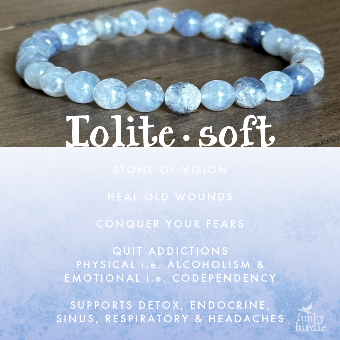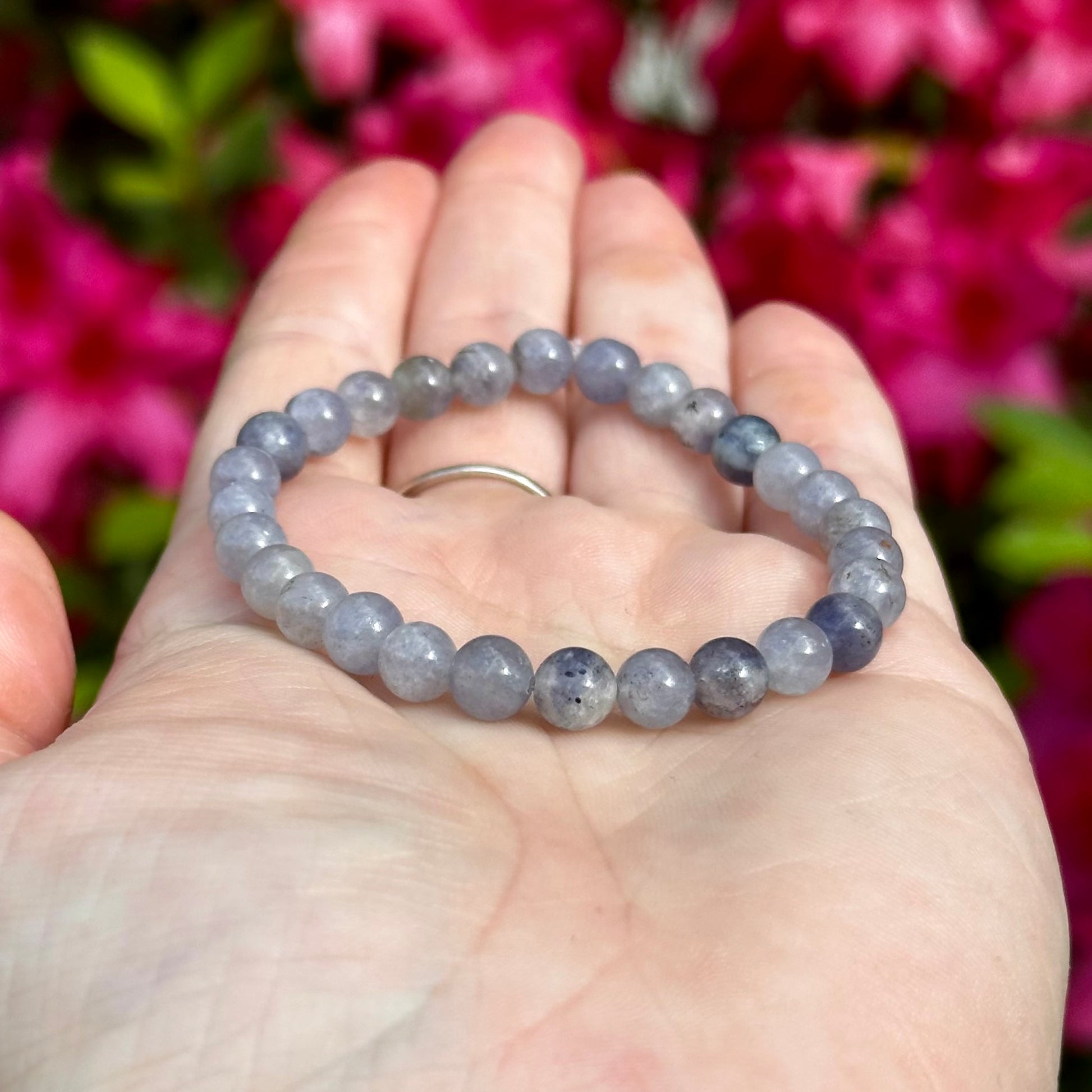 Iolite Soft Single Stone Stretchy Stacker bracelet is strung on stretch cord & does not require a clasp. Beads measure approx. 6mm. Due to the natural materials used, your piece will differ slightly than what is pictured. Photos have been enlarged to show detail. Colors shown may vary due to your monitor settings. This listing is for a one bracelet, other items shown are photo props.