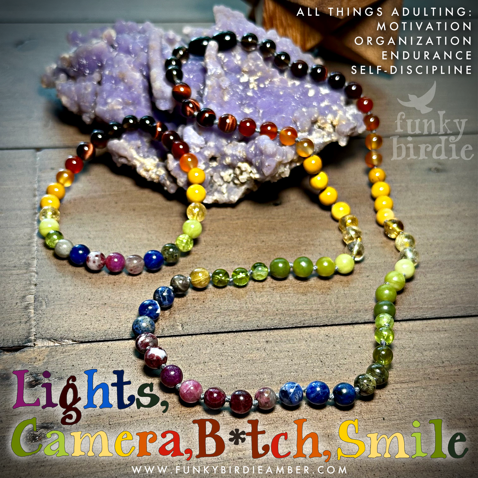 Lights, Camera, B*tch, Smile! Adulting Crystal Necklace is hand-knotted between each bead on slate-toned nylon cord & finished with a black plastic screw clasp. Crystals measure 6mm. Photos have been enlarged to show detail. Colors shown may vary due to your monitor settings. Due to natural materials used, your jewelry will differ slightly from what is pictured. This listing includes one necklace, other items shown are photo props & other items in this line.