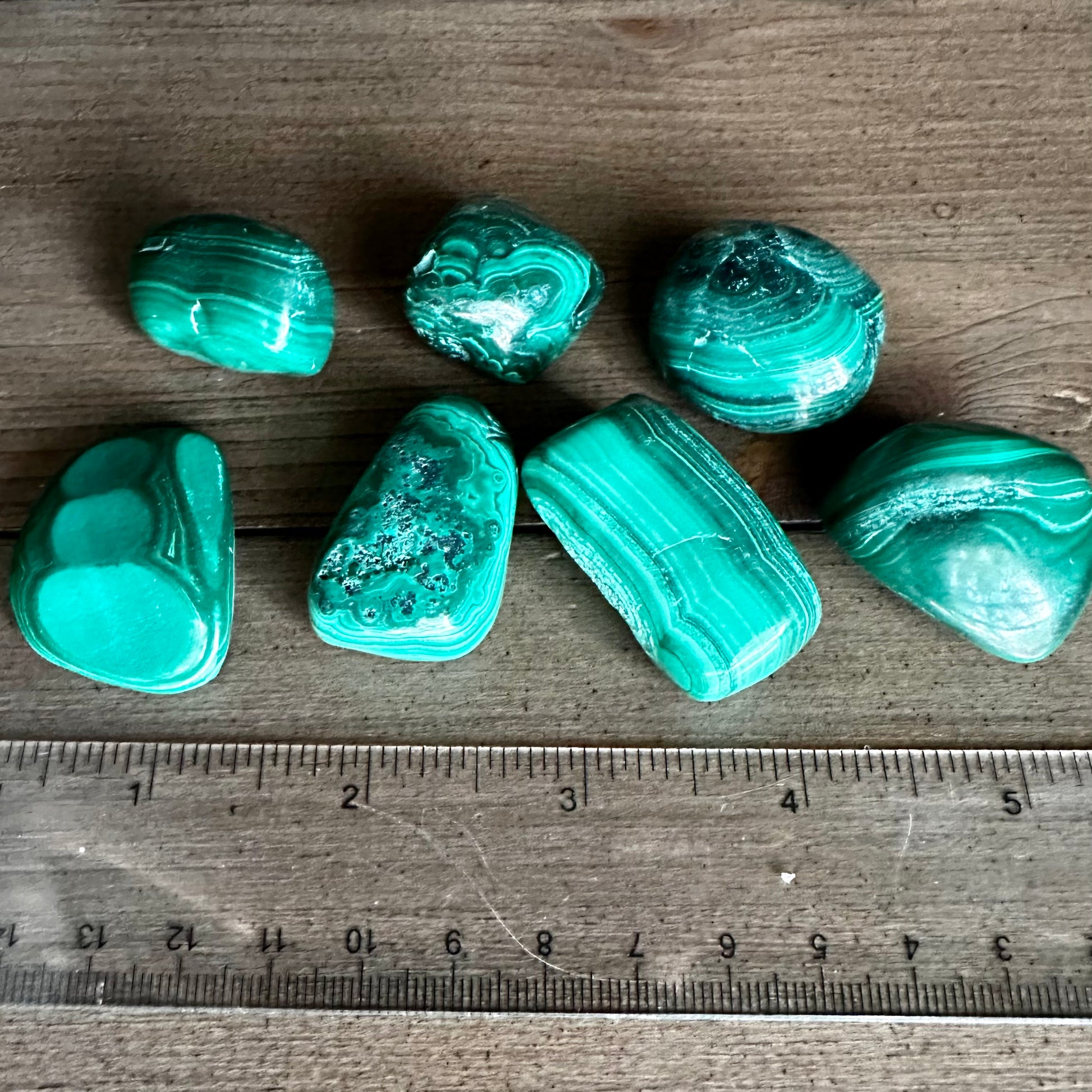 Approximately 30-40 mm or 1 1/8-1 1/2". This listing includes 1 malachite tumble stone, other items shown are photo props. Your malachite will be intuitively selected for you.