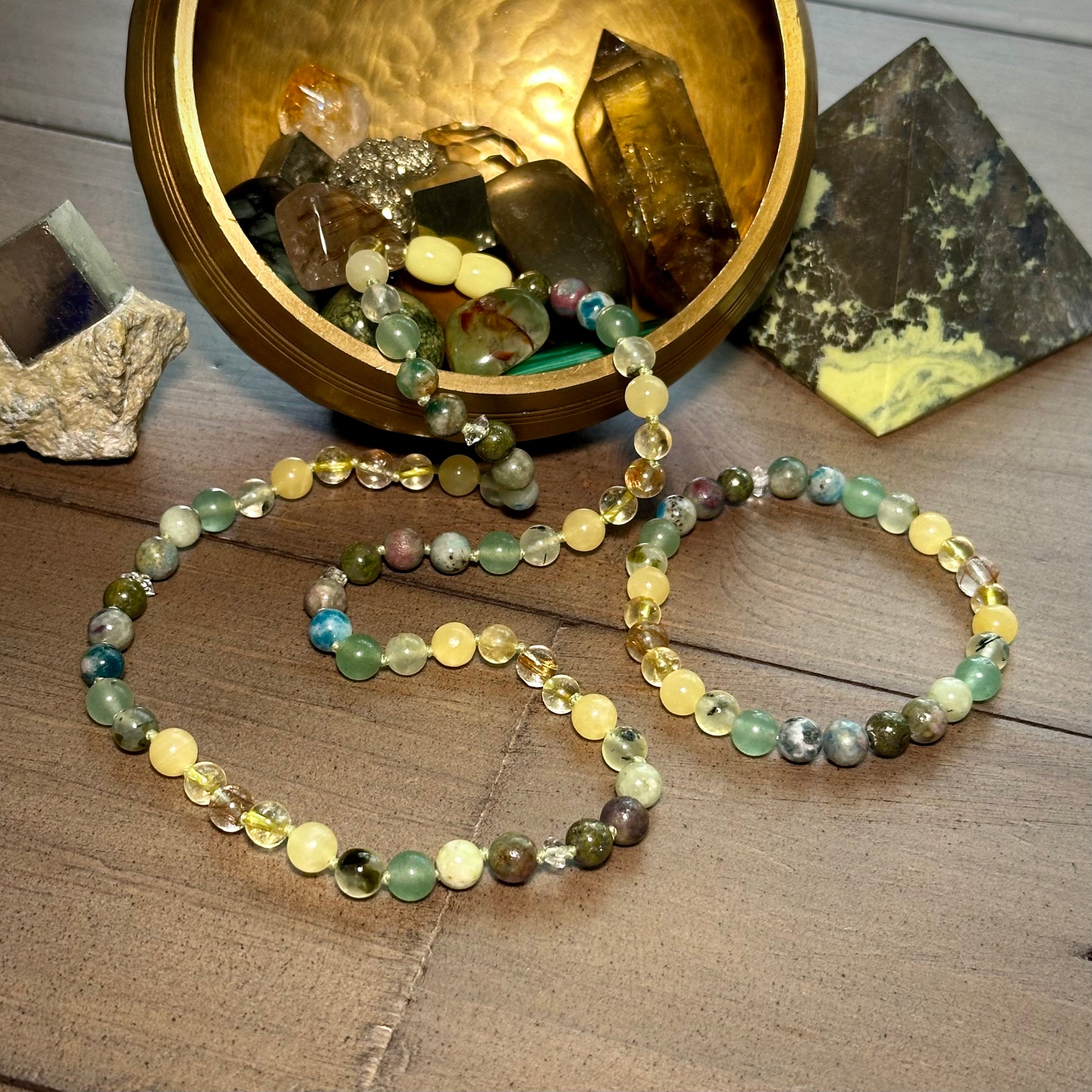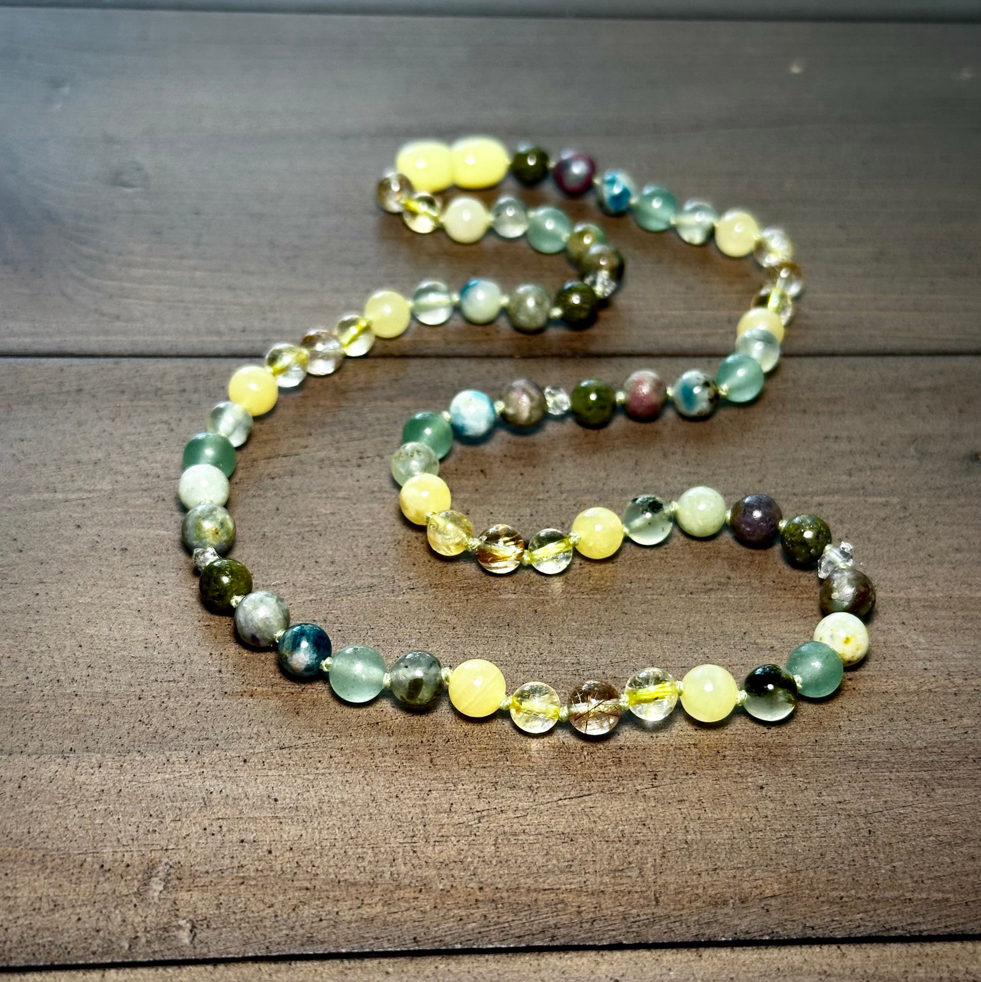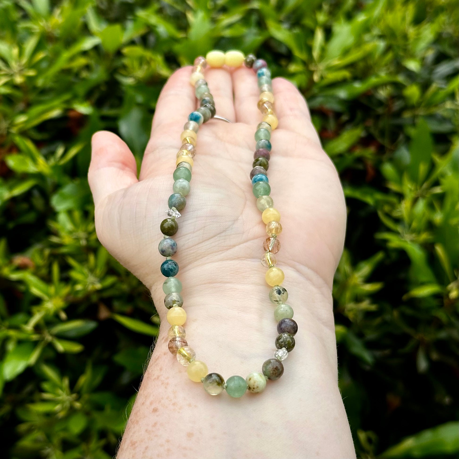 Minted Crystal Necklace is hand-knotted between each bead on honeydew-toned nylon cord & finished with a milky plastic screw clasp. Round crystals measure 6mm, Herkimer diamonds measure approximately 3-4mm. Photos have been enlarged to show detail. Colors shown may vary due to your monitor settings. Due to natural materials used, your jewelry will differ slightly from what is pictured. This listing includes one necklace, other items shown are photo props.