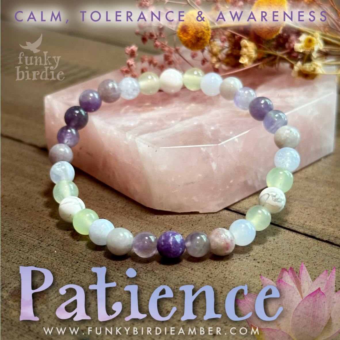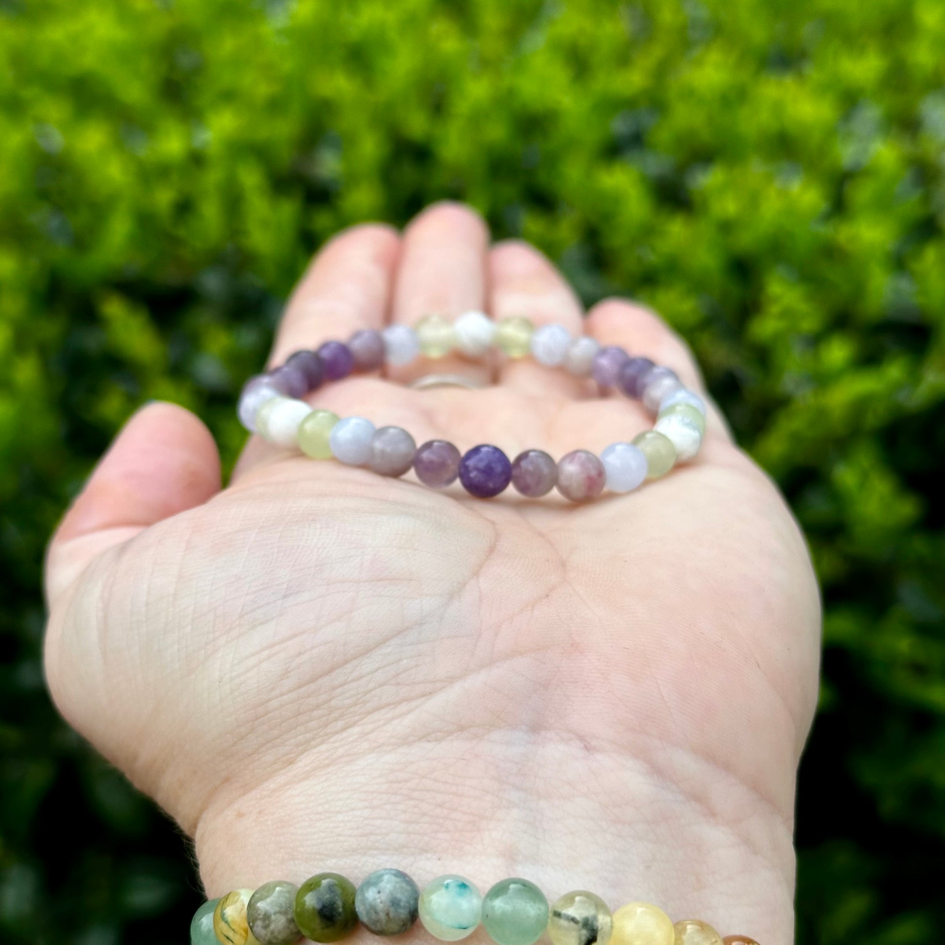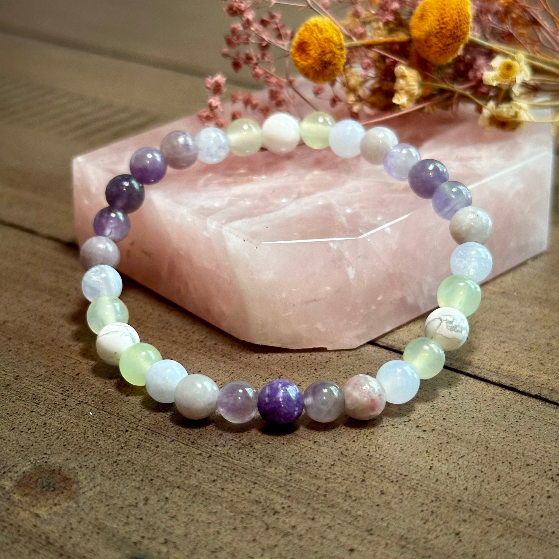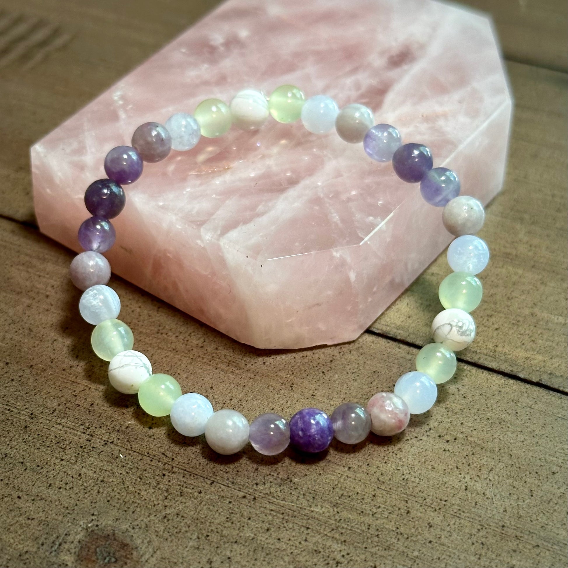 Patience Healing Crystal Stacker bracelet is strung on stretch cord & does not require a clasp. Crystals measure 6mm. Photos have been enlarged to show detail. Colors shown may vary due to your monitor settings. Due to natural materials used, your jewelry will differ slightly from what is pictured. This listing includes one bracelet, other items shown are photo props.