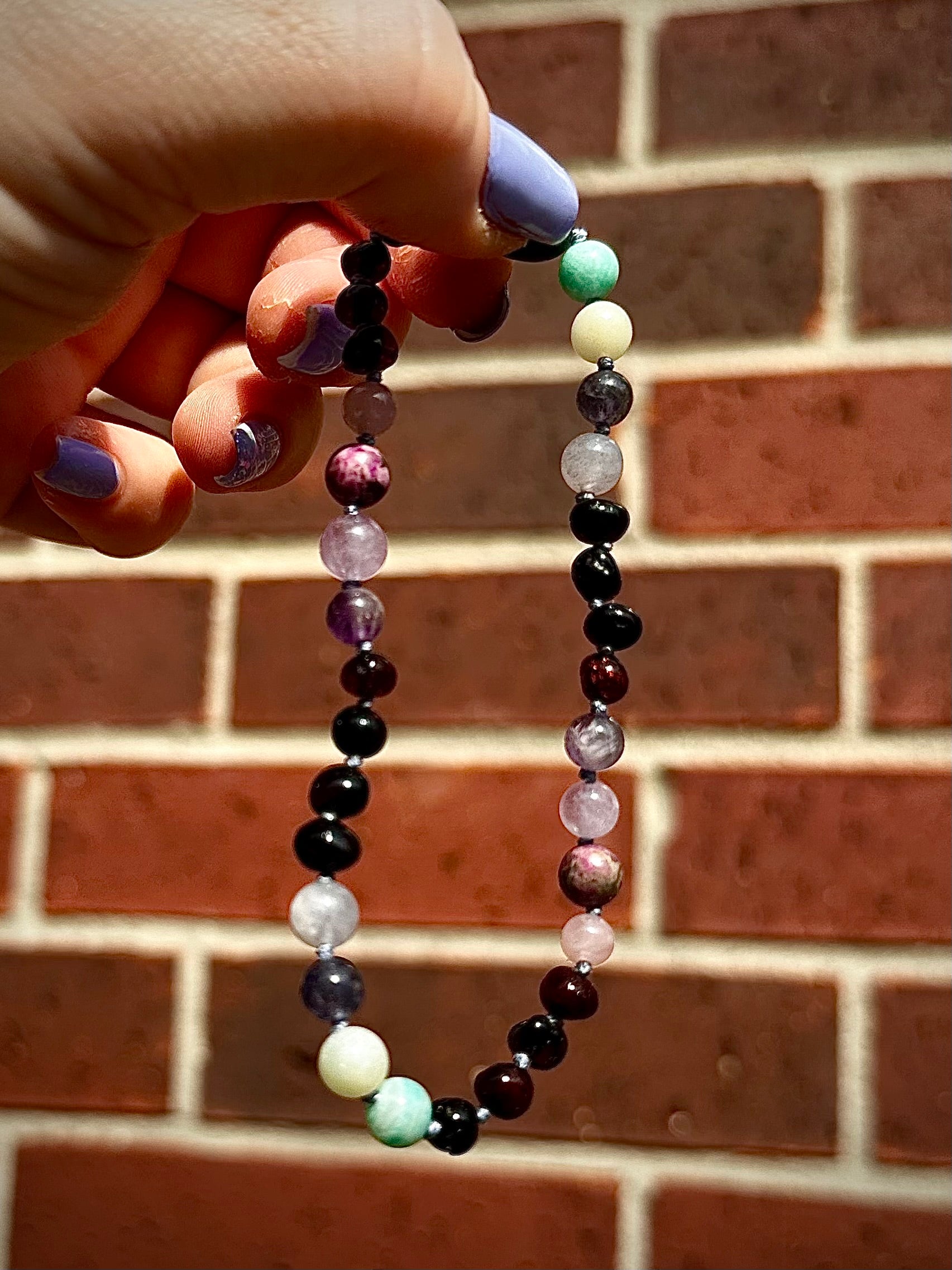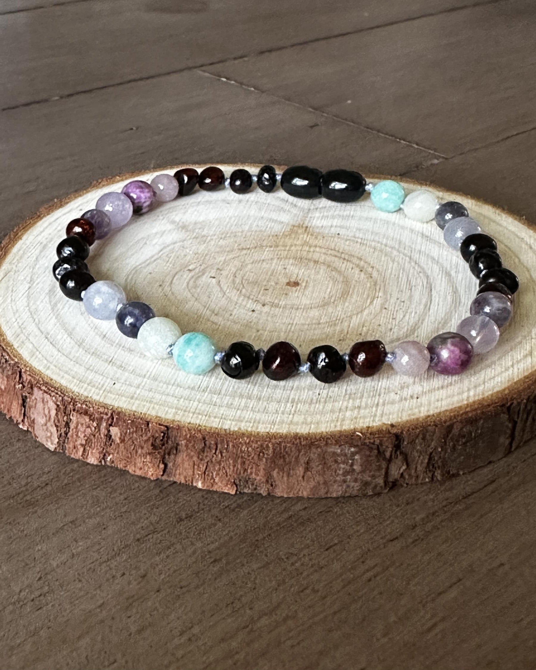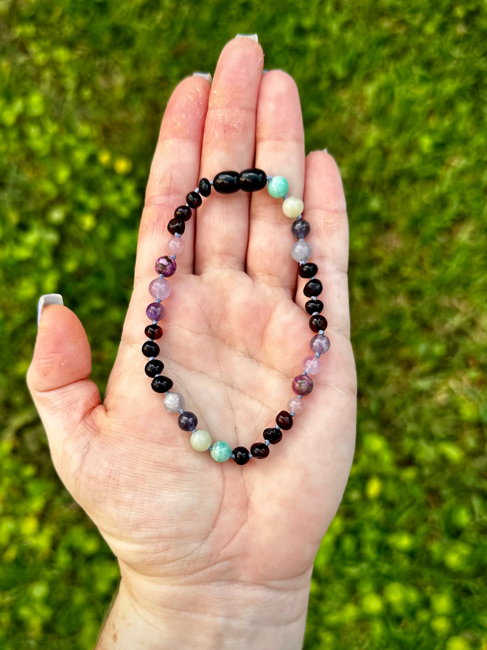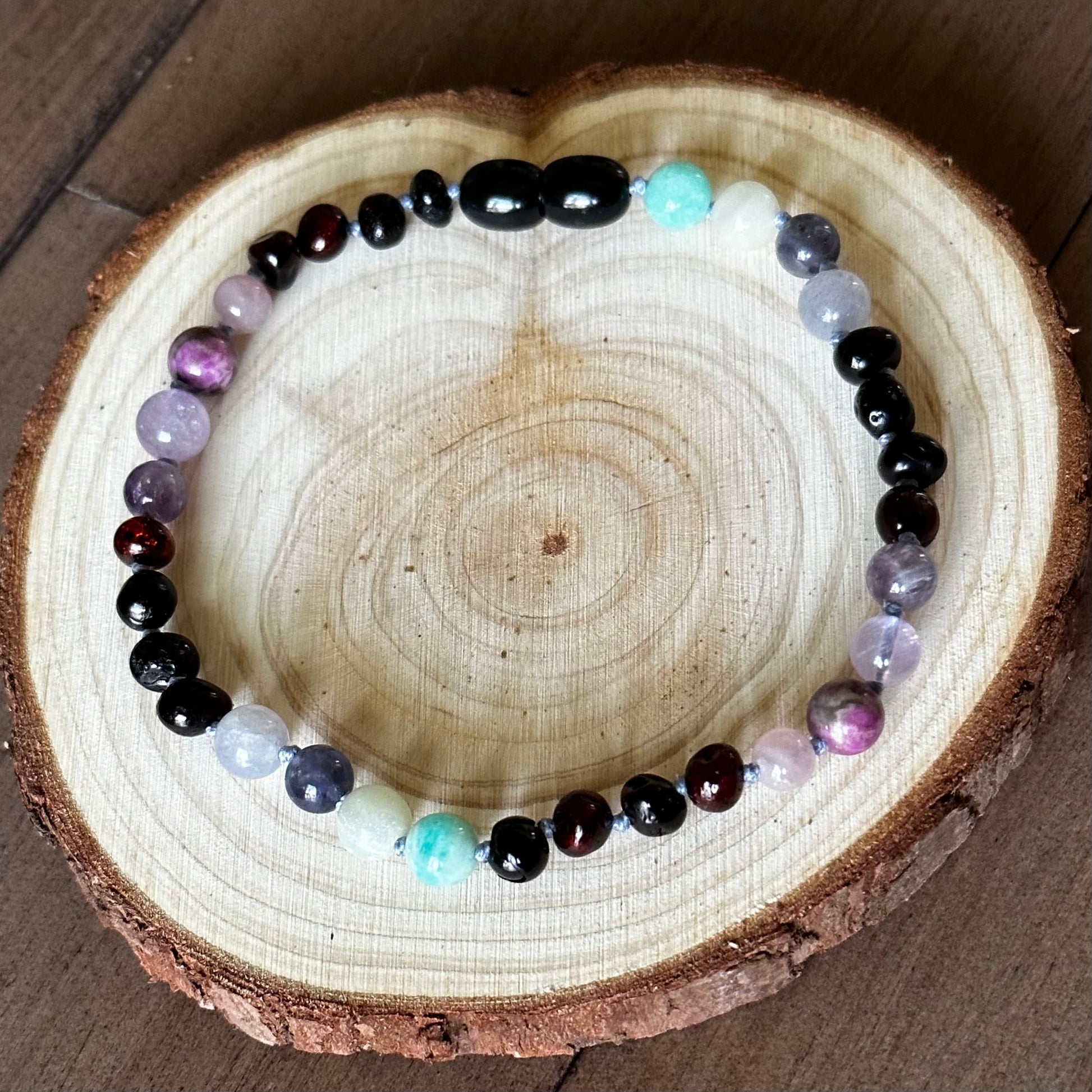 Restless Leg RLS Relief Anklets are hand-knotted between each bead with periwinkle nylon cord & finished with a coordinating plastic screw clasp. Amber measures approximately 4-6mm, crystals are approximately 6mm. Photos have been enlarged to show detail. Colors shown may vary due to your monitor settings. Due to natural materials used, your jewelry will differ slightly from what is pictured. This listing includes one anklet, other items shown are photo props.Â
