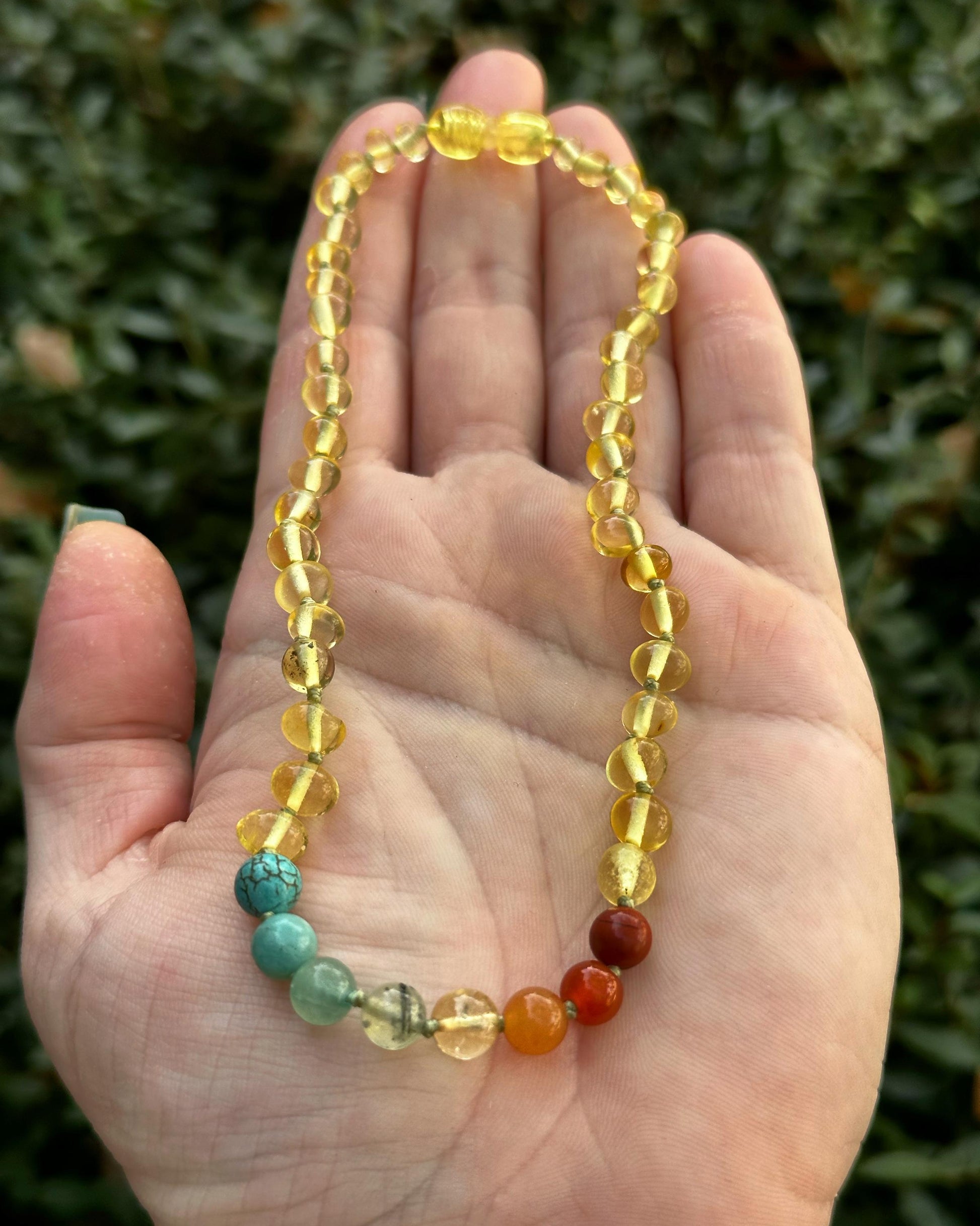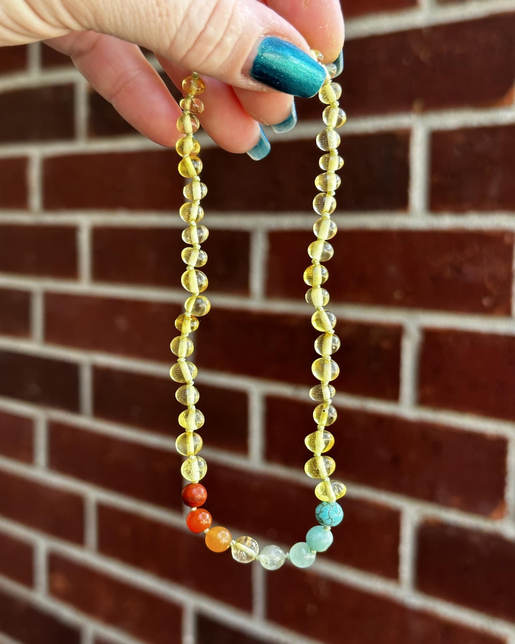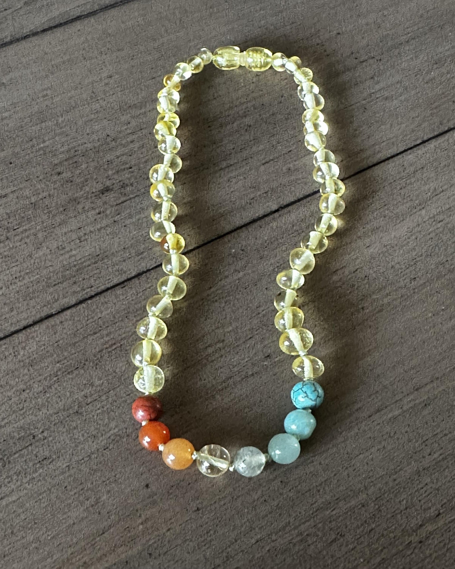 Retro Rainbow Teething Necklace is strung on mustard-toned nylon cord and finished with your choice of coordinating plastic pop or screw clasp. Crystals are 6mm rounds, amber measures 4-6mm. Photos have been enlarged to show detail. Colors shown may vary due to your monitor settings. This listing is for one necklace, all other items are photo props & other pieces in the line