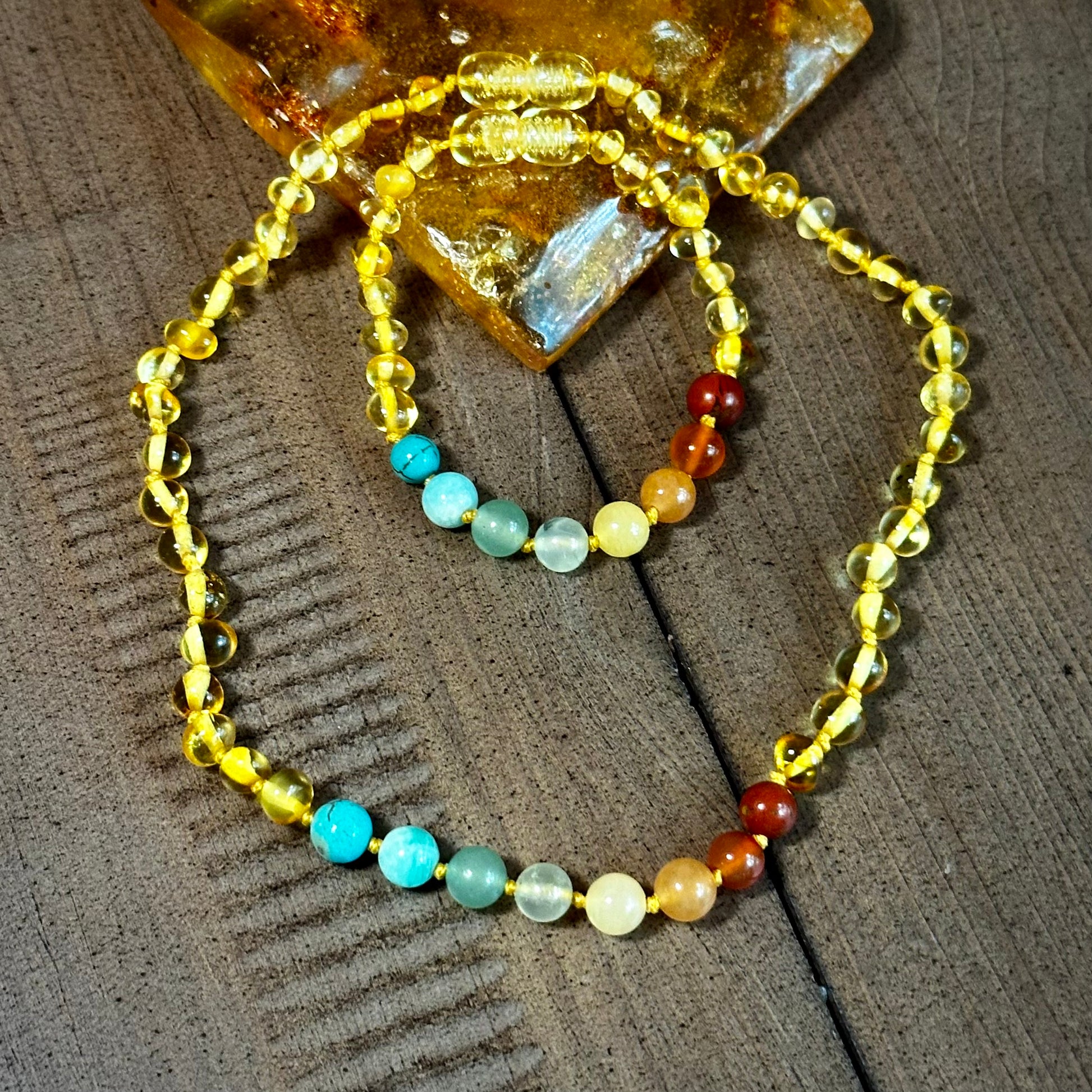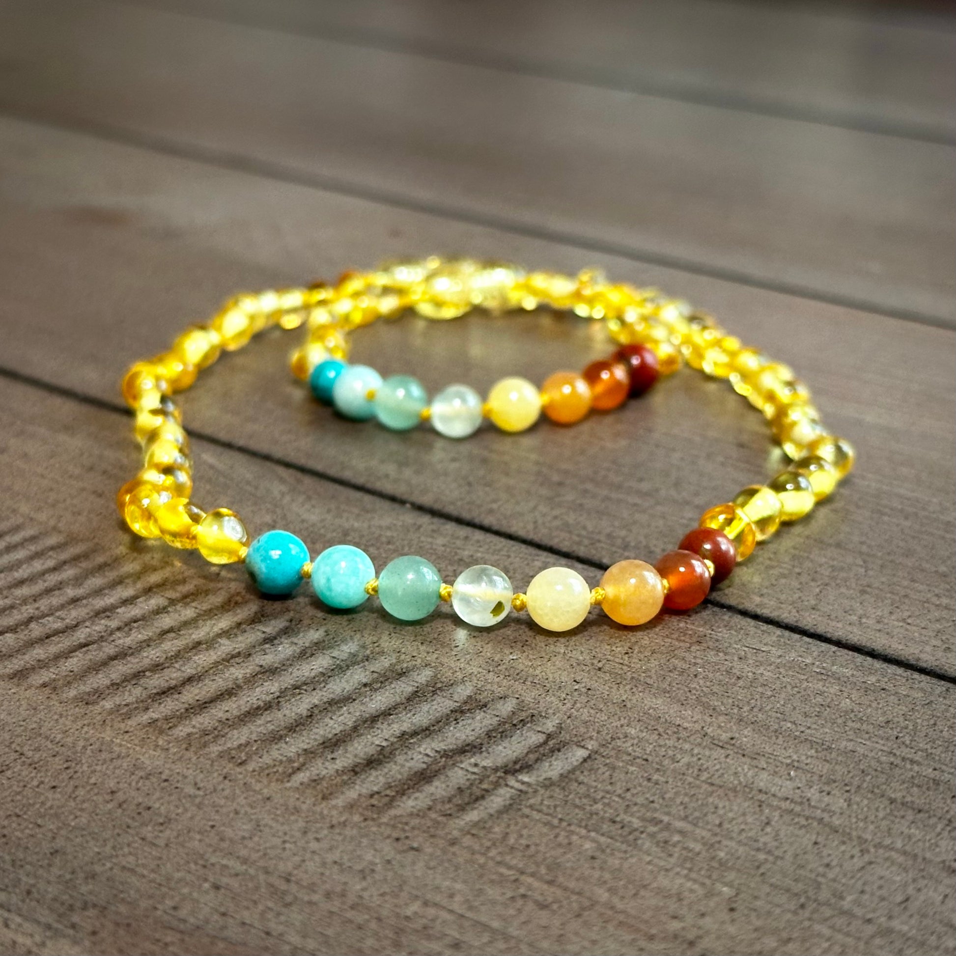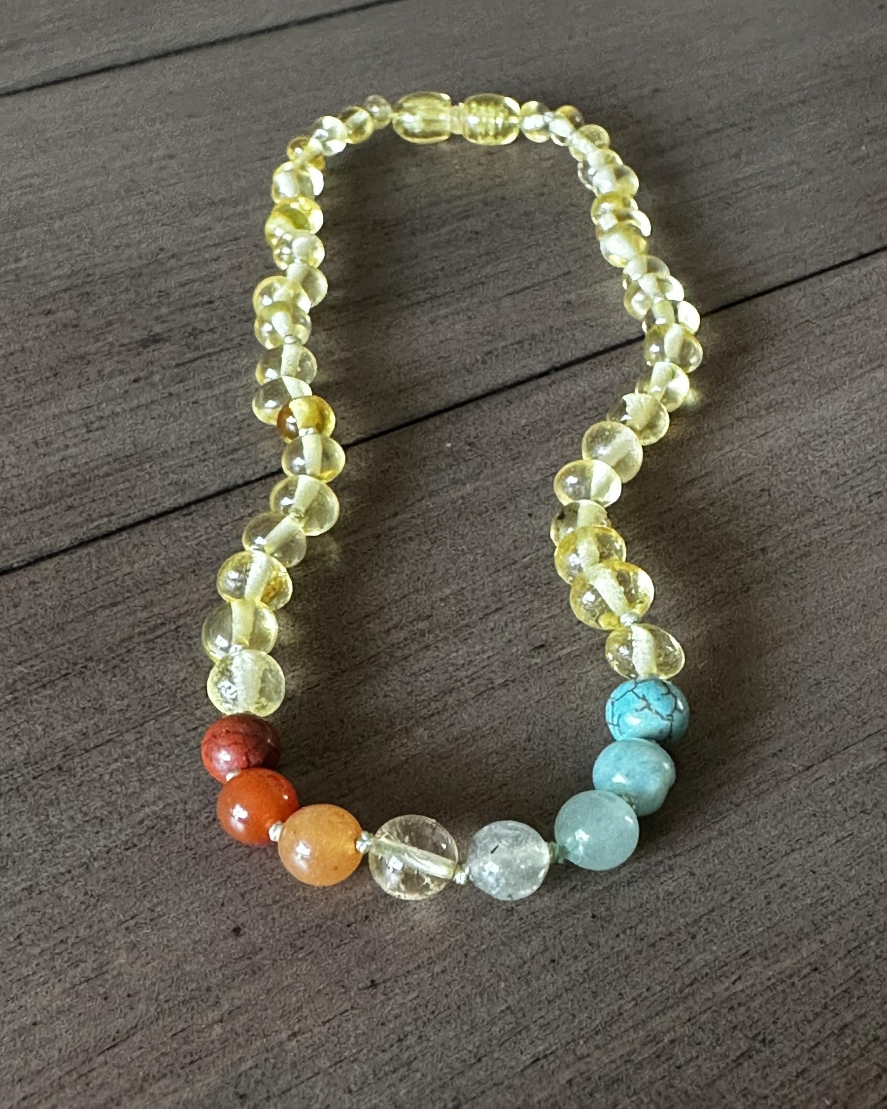 Retro Rainbow Teething Necklace is strung on mustard-toned nylon cord and finished with your choice of coordinating plastic pop or screw clasp. Crystals are 6mm rounds, amber measures 4-6mm. Photos have been enlarged to show detail. Colors shown may vary due to your monitor settings. This listing is for one necklace, all other items are photo props & other pieces in the line