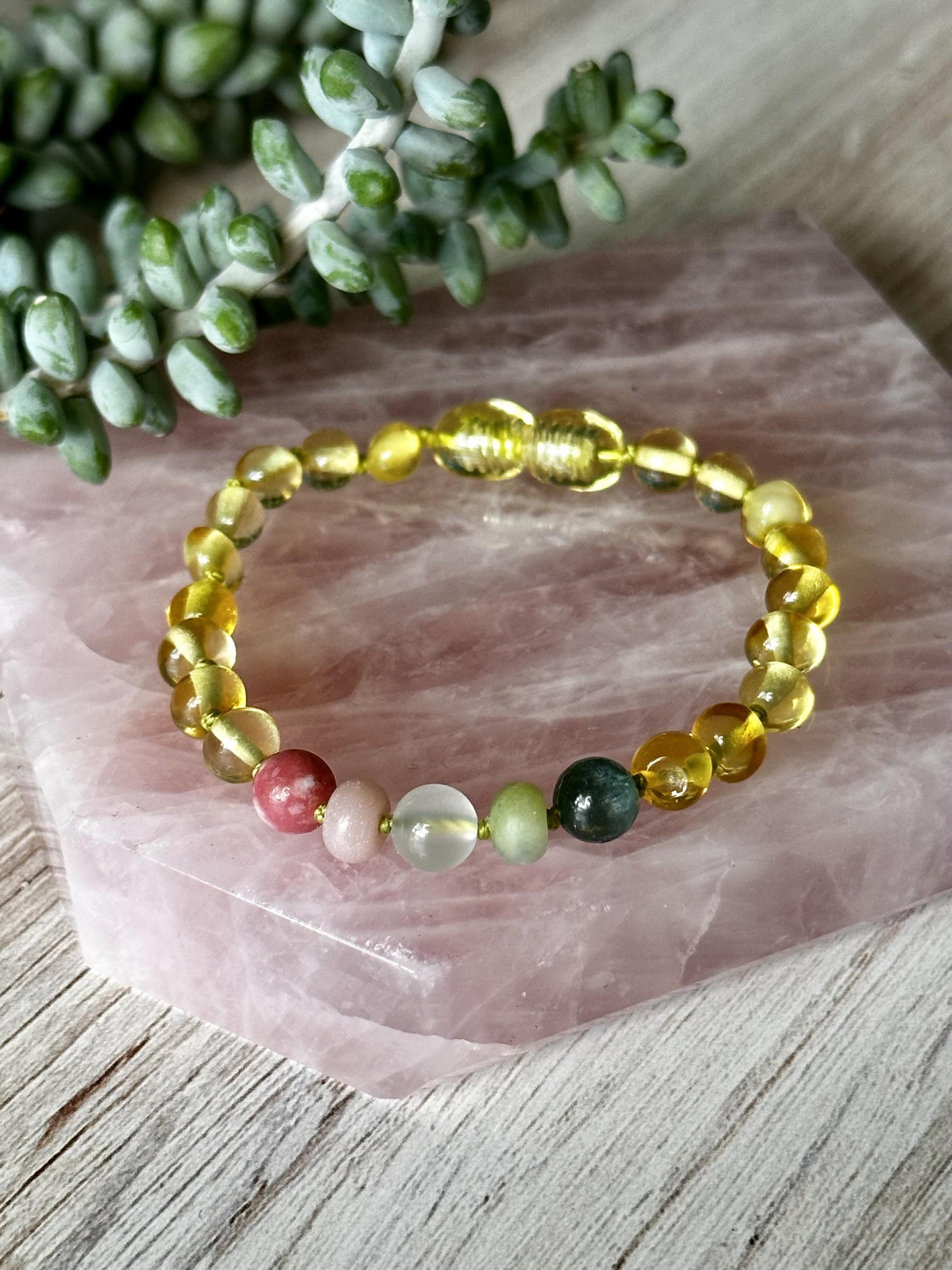 Polished lemon Baltic amber with crystal centerpiece: NEW round green apatite, lime jade rondelle, white round moonstone, pink opal rondelle & NEW round thulite