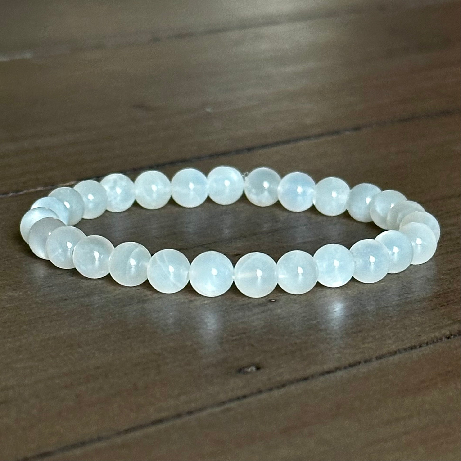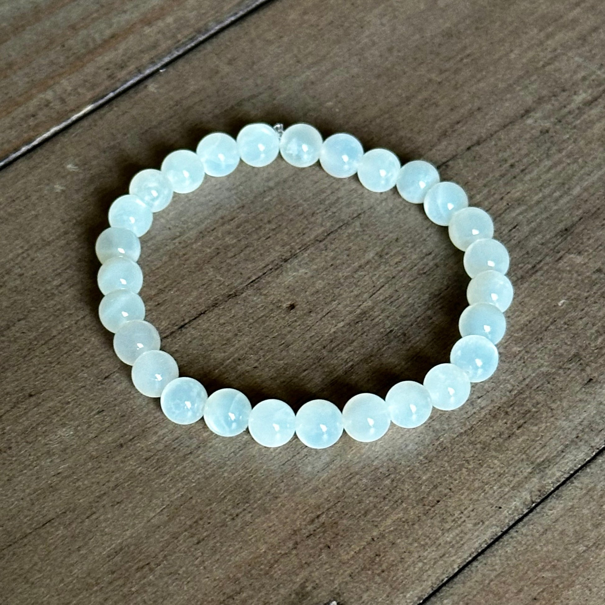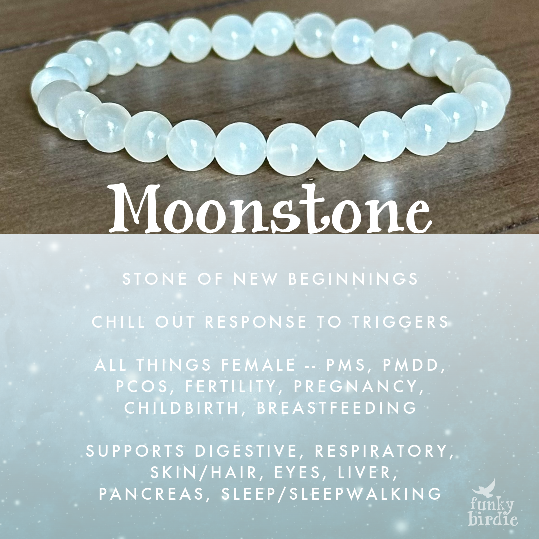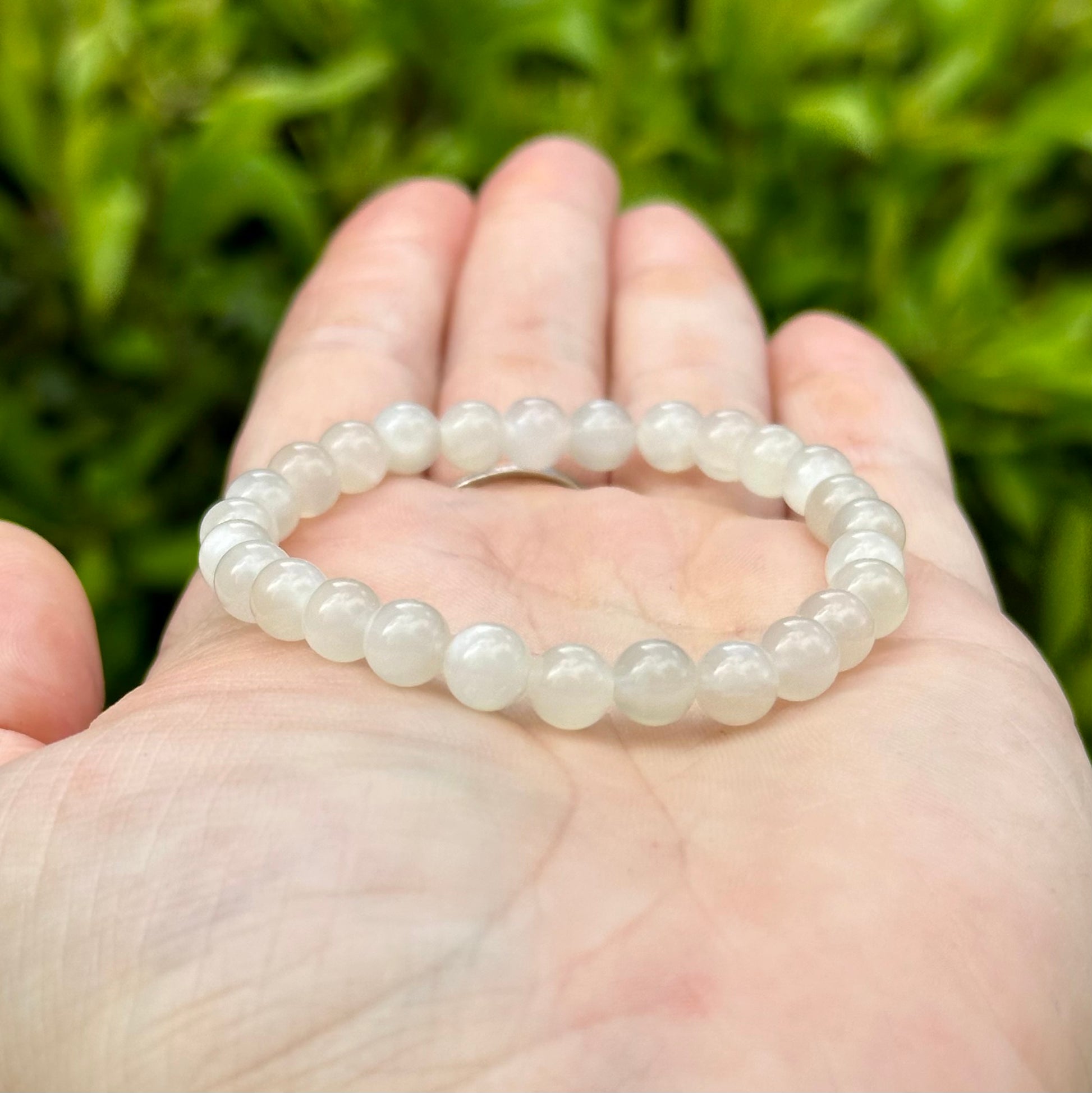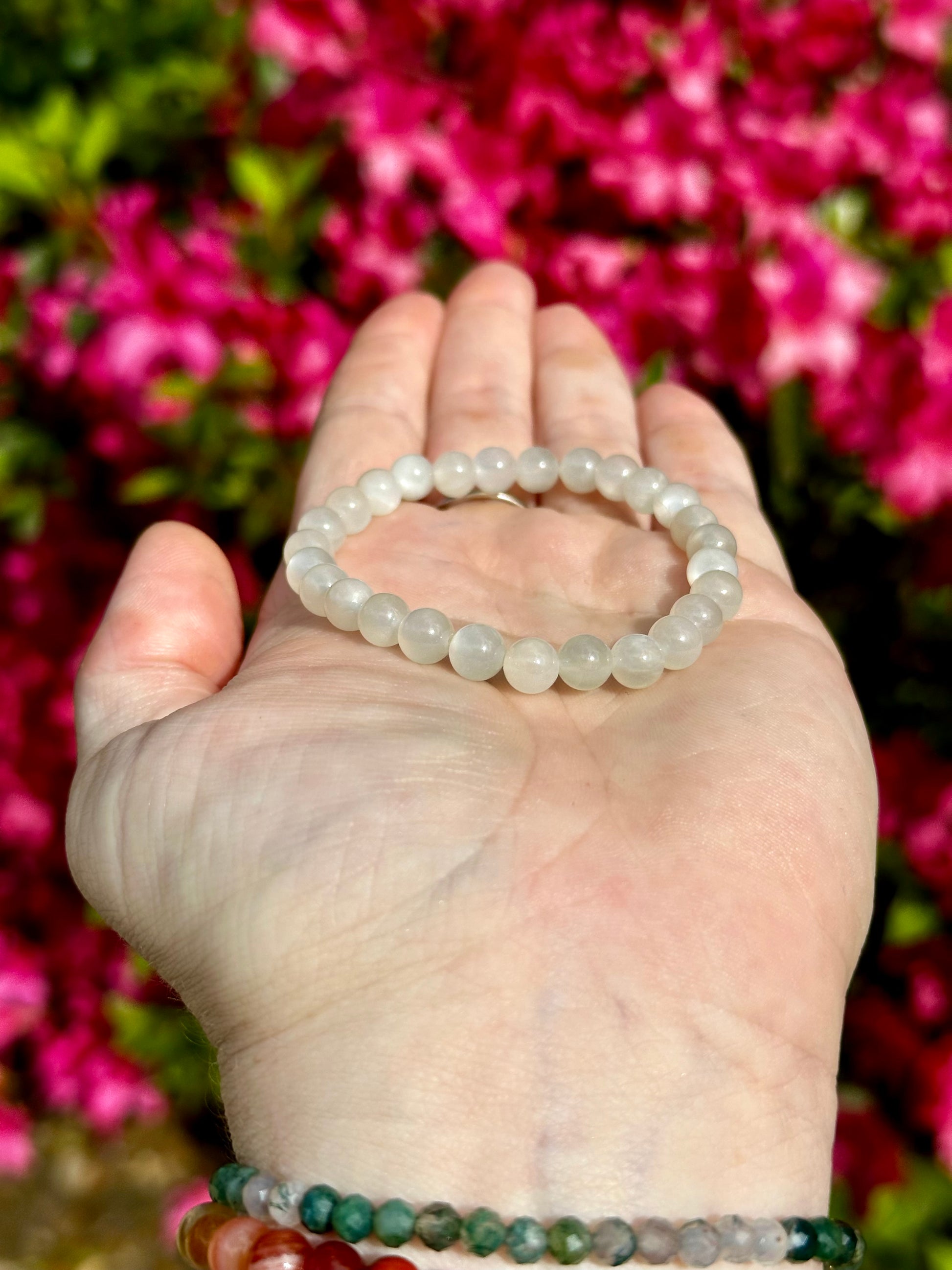 White moonstone Single Stone Stretchy Stacker bracelet is strung on stretch cord & does not require a clasp.Â